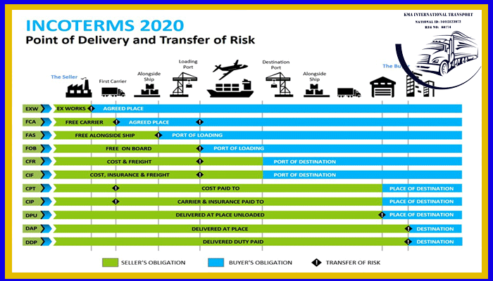 اصطلاحات انواع اینکوترمز (Incoterms) اصطلاحات استانداردی هستند که برای تعیین مسئولیتها و هزینههای مربوط به حمل و نقل کالاها در قراردادهای تجاری استفاده میشوند. این اصطلاحات توسط بینالمللی تجارت (ICC) تعیین شده است و در قراردادهای بین المللی بسیار استفاده میشوند. برخی از اصطلاحات اینکوترمز عبارتند از:
